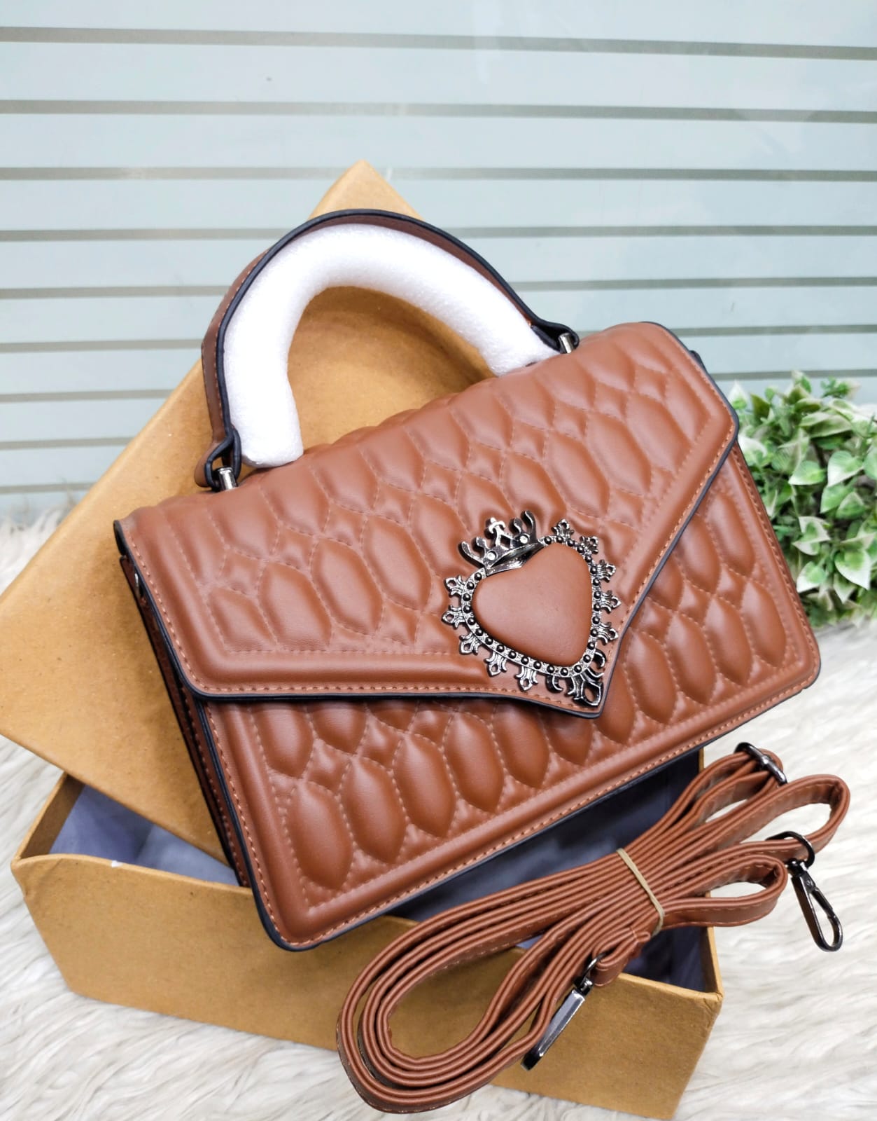Elevate your style with this premium quilted handbag in a stunning Brown tone. Adorned with a royal heart-shaped charm and crown detail, this bag blends elegance with a modern edge. The rich texture, fine stitching, and quality synthetic leather make it a perfect companion for both formal and casual looks. Comes with a detachable long strap for shoulder or crossbody styling. Perfect for parties, special events, or daily glam!